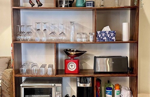 • You’ll find (at a minimum,) butter, tomato sauce, stock cubes, sugar, Lavazza gold coffee (works with plunger supplied), multiple tea offerings (loose leaf and bags), pancake mix, peanut butter, vegemite, honey, olive oil, dried basil & oregano, pepper, salt, cinnamon, Nescafé gold, some yummy ice creams in the freezer + more.