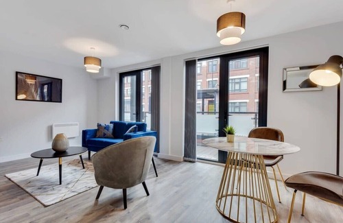 This stylish and spacious 1 bedroom apartment sits in the heart of the city within a modern development. The beautifully designed interior boasts floor-to-ceiling windows, contemporary furnishings, and all the essentials for a comfortable stay. Conveniently located, it’s just a 10 minute walk from New Street train station and only 2 minutes from the coach station. Guests can enjoy free Wi-Fi, with fresh linen, towels, and toiletries provided at the start of their stay.