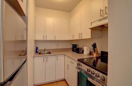 Spacious and fully equipped 1 bedroom in downtown Laval. Perfect for employment contract, relocation, students. 24 hour security guard, gym, cinema. Full kitchen, fast and reliable wifi, perfect for long stays.