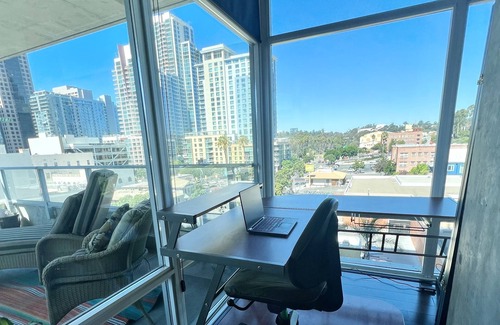 One of a kind 6th floor unit in high-rise w/floor to ceiling windows in 1350ft living space. Peek-a-boo Bay and panoramic cityscape views from the large private balcony. A newly renovated fitness center, rooftop BBQ & Jacuzzi! Easy transportation w/trolley & bus stop integrated into the base of the building. Parking & in-unit laundry included! Located in Downtown SD w/walkability to the famous Gas Lamp District, Little Italy, Petco Park, Balboa park, convention center & more.Sleeps 4 with additional sofa bed.