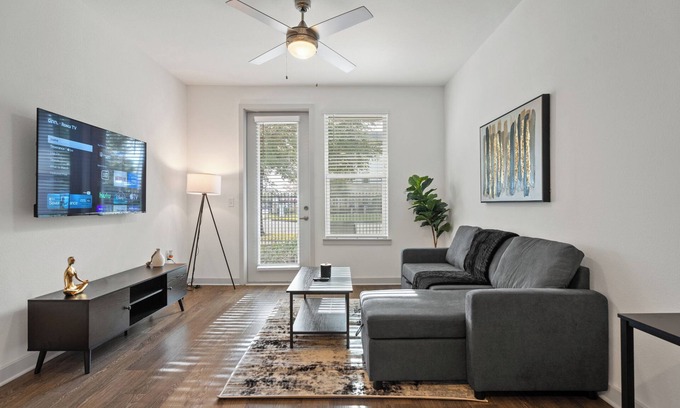 This Spacious apartment getaway will leave you in awe with its carefully picked amenity list. The apartment is located on the 1st floor. Wood floors extend throughout the living area and kitchen. The living area combines the living and the dining room with the kitchen, creating a contemporary open concept design space.