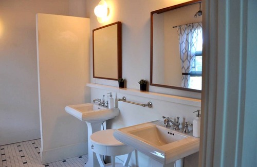 There are two bathrooms in the loft: the master bathroom is attached to the bedroom and has two sinks, a shower, and a freestanding bathtub. The guest bathroom is a full bathroom with a sink and as shower.