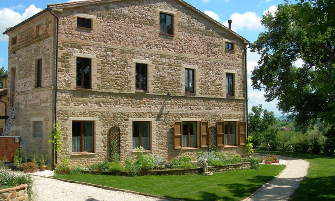 Apartment Vettore is on the ground floor of a large extension to thel farmhouse, Casa Carotondo. It has two bedrooms and two bathrooms and provides accommodation for up to six people. From the terrace there is a view of the mountains while the windows of the apartment face northwest with a view of hills and woodland. The northerly aspect ensures that the apartment stays cool in summer. All windows have been fitted with fly screens. Apartment Vettore has its own entrance and a large outdoor terrace to the right of the building with table and chairs for al fresco dining. A large oak tree provides welcome shade during part of the day in the summer. The apartment is about 85 sq.m. It has been newly renovated throughout to a high standard with the old stone walls left exposed where practicable. The unusually large windows, high ceilings and generous room sizes give this apartment a pleasantly light and airy feel.