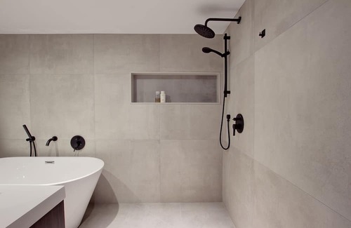 Downstairs, you will find the sleeping areas and spa-like bathroom. In the main area, there is a desk for working remotely and a queen-sized bed with a brand new memory foam mattress. The bathroom has a large soaker tub and open shower. The washer and dryer are also located in the main area.