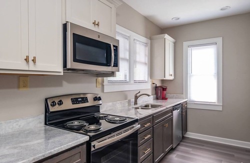 This NEWLY RENOVATED 2 Bed 1 Bath unit is located on the second floor of a duplex. The bottom unit is utilized as a long term rental. This space is perfect for small groups, couples, or business travelers. Upon arrival you'll be greeted by the brand new modern kitchen and refinished hardwood floors. The quaint sitting area is perfect for taking a break from the days activities. Two private bedrooms with new comfortable bedding (1 king, 1 queen) and a brand new modern bathroom make this loft the perfect space for a trip to Louisville.