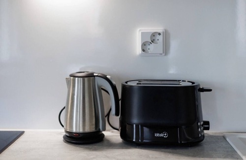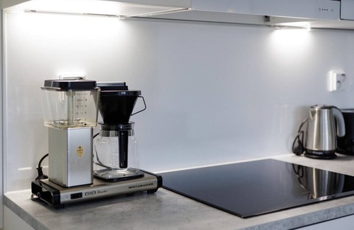The modern bathroom includes a refreshing rain shower, plus a washing machine and dryer—ideal for both short visits and longer stays. And to top it all off: your very own private sauna, the perfect way to relax like a local after a day in Jyväskylä.