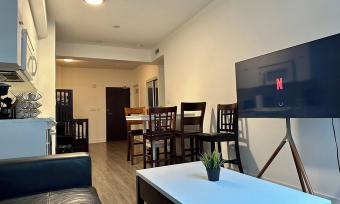The whole group will enjoy easy access to everything from this centrally located place. Views of the City and park. Immerse yourself in the luxury of this modern design, clean and fresh with all the essentials . Enjoy this stunning suite for a fraction of the cost of a hotel. My place is close to Harbourfront Centre, Amsterdam BrewHouse, Williams Landing, and Tim Hortons.s. My place is good for couples, solo adventurers, business travellers, families (with kids).