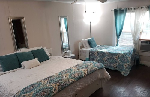 Josie's Haven is a 3 bedroom and 2 full bath home that sleeps up to 10 people. Each bedroom can sleep between 2 to 3 people comfortably. In addition, there are 2 full-size air mattress in game room closet and 2 twin mattresses under each king bed that can be used. The home has beautiful cherry wood hardwood floors, unique interior architecture designs, and is the perfect layout for extended stays.