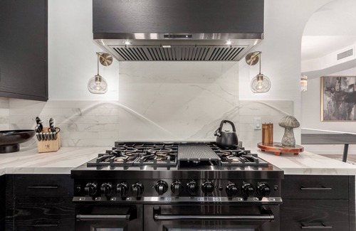 The fully equipped chef’s kitchen is a culinary dream, featuring high-end appliances, ample counter space, and everything needed to prepare delicious meals.