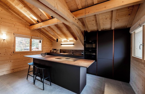 A staircase leads to the 1st floor. You arrive in a large open living room composed of a lounge with a large sofa and armchairs to peacefully enjoy the ethanol fireplace. A balcony allows you to enjoy the views of all the peaks, especially the Criou and the Bourgeoise. You then go into the dining room which can accommodate up to 12 people then into the fully equipped open kitchen with an island with 4 bar stools. From the dining room you have access to a large, very sunny wooden terrace.