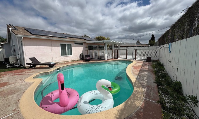 This San Diego house boasts 5 inviting bedrooms, including 1 king bed, 1 bunk bed, 1 murphy bed, and 2 queen beds. With 3 bathrooms offering a shower, bidet, and bathtub, guests will feel right at home. The home has a beautiful backyard and solar heating pool. Experience what San Diego has to offer with a stay at our marvelous house. 25 min drive to SD airport, San Diego SeaWorld, San Diego Zoo, and lots of beautiful beaches