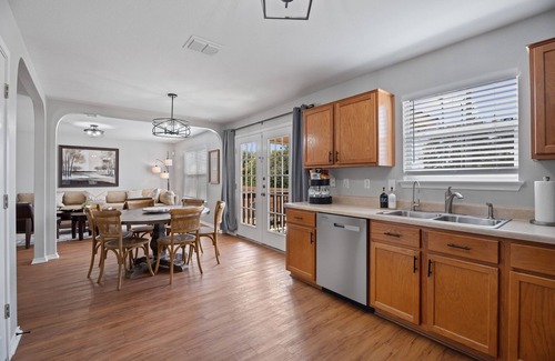 Welcome to this spacious and inviting 5-bedroom, 2 1/2-bath home, perfect for families, groups, or business travelers. Nestled in a peaceful neighborhood, this home offers a blend of comfort and convenience with modern amenities and thoughtfully designed living spaces. Whether you're relaxing in the family room, enjoying a meal in the fully equipped kitchen, or unwinding on the outdoor deck, this home has everything you need for a memorable stay. The fully equipped kitchen flows into the dining area and family room, creating a perfect space for gathering and making memories.