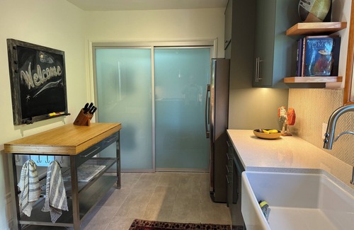 The Treehouse is comprised of 1,200’ of floor space featuring two bedrooms and two bathrooms, a large deck with a city-lights view, and an open living/dining space with recessed lighting and beautiful hardwood floors. Other features include: 65” HDTV flat screen TV, Sonos sound system, in-unit washer/dryer, dishwasher, microwave, stainless-steel refrigerator, and one reserved parking place on the property (street parking is also plentiful). The Treehouse has a brand new, fully stocked chef’s kitchen and the interior and exterior have been recently painted.
