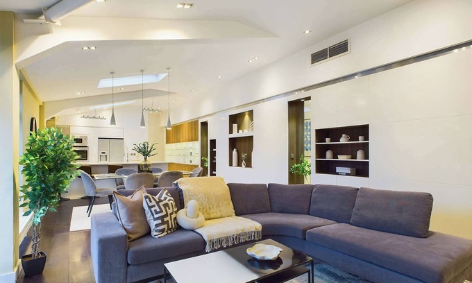 A modern and spacious four-bedroom apartment near Belsize Park, perfect for families and groups, featuring high-tech amenities and stylish interiors.