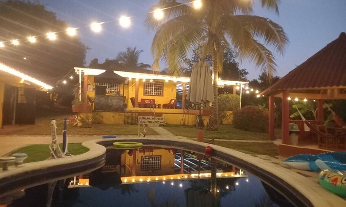 Unwind in Paradise at this unique, family-friendly beach house. Enjoy seclusion and security with your family and friends. Listen to the tropical birds, enjoy the mid-day breeze; appreciate the flowers and fruit trees of the lush garden from the hammocks; soak in the beautiful new pool; listen to music, barbecue, have a few drinks at the bohio's rustic bar, and on and on. 8-minute drive to the closest beach, 15-min to popular beaches in the San Carlos area. Pet-friendly. Search "Casa Don Tiento Tour Virtual".