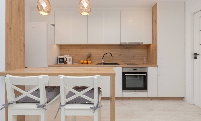 The spacious apartment on Niska Street in Gdansk is an excellent choice for family vacations - it guarantees accommodation for as many as 6 people. The living area includes a large living room with kitchenette, two bedrooms and two bathrooms. In the living room is located a comfortable corner sofa bed, a flat screen TV and a dining area, which seamlessly connects to a practical kitchenette stocked with all necessary accessories. With its comprehensive furnishings and modern-style furnishings, the interior is a remarkably comfortable holiday retreat. A calm color palette and eye-pleasing accessories will satisfy the aesthetic sense of guests. In addition, a desk in one of the bedrooms and a high-speed Wi-Fi connection allow guests to work remotely in comfort, so they don't have to worry about fulfilling business obligations. Multimedia amenities - a TV with SmartTV and complimentary Wi-Fi Internet connection - are provided for travelers' use. Taking care of a good start to the arrival, complimentary toiletries, towels and linens are provided. Guests traveling with pets are welcome here - pets are accepted for an additional fee.