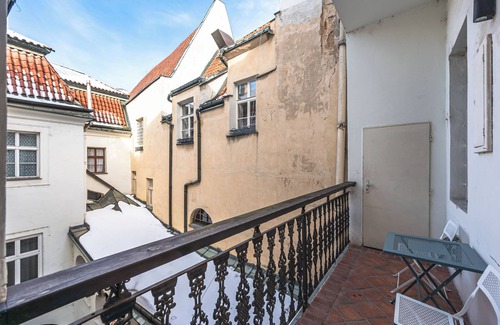 Apartment of 100 m2 on the 2nd floor of a historic building with elevator and vintage terrace. This is a unique location, a short walk from the Old Town Square. The apartment is fully equipped and offers everything for your comfortable stay in the center of Prague.