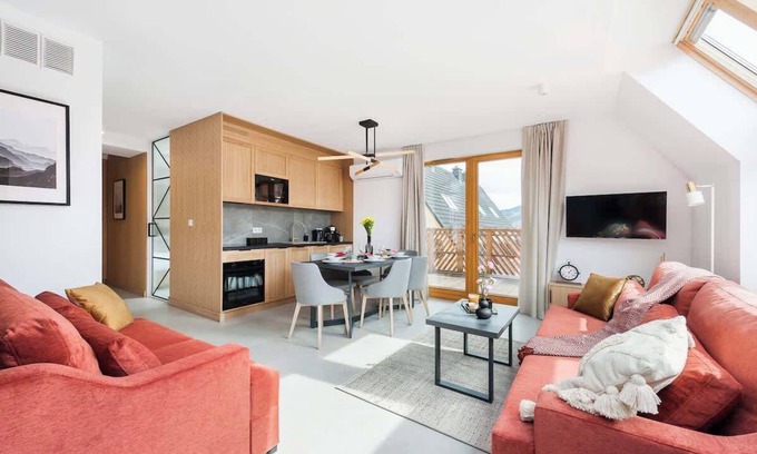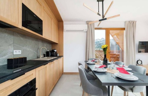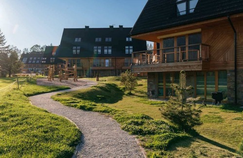 Relax in a comfortable apartment in a green mountain enclave with a view of Giewont, located right next to the Tatra National Park. We offer our guests a space that combines the Podhale tradition with modernity. Here, you will find an outdoor relaxation area, a children's playground, and water ponds that create a charming atmosphere.