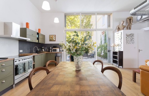 This is a fully equipped loft with a modern, new kitchen and bright spaces. You will enjoy peace and comfort for a family of 4, with a whirlpool bathtub for relaxation, a television, and a huge shaded terrace under plane trees. This house is unique. Industrial-style air conditioning ensures an ideal temperature according to your needs. Large bay windows let in the intense light of southern France.