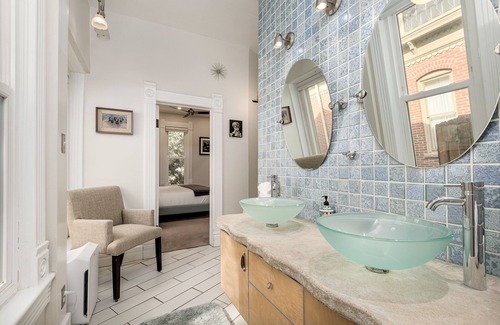 Built in 1886 and thoughtfully renovated by a creative couple in 2004, this house has a wide open large entertaining space but still feels like an older home with exposed brick, transom windows, grand high ceilings and original fixtures. The next door neighbors said that Mark Twain once stayed in the house. If you decide to stay in, the kitchen is fully equipped for making almost any meal with spices and oils for your use. Downstairs is a game room made up like an old Speakeasy with a poker table and 12’ Shuffleboard table ready for a fun evening in.