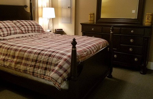 The space is two bedrooms with a common area and bathroom. The common area has a sofa (that can be used if there are more guests than can fit in the bedroom) and dining set. The common area also has a mini- fridge, a microwave, and a coffee maker.