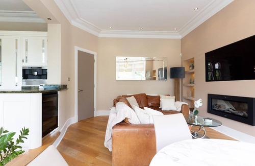 Living Room - Spacious living space with electric fireplace, dining room area, large flatscreen TV and some great views over the park.