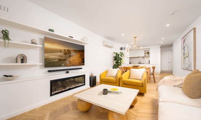 Living Area: Enjoy open-plan living enhanced by expansive floor-to-ceiling windows that bathe the space in natural light, complemented by automated blinds and sheer curtains for effortless ambiance control. It seamlessly connects to the balcony, creating an easy indoor-outdoor flow. An electric fireplace adds a cozy touch, while a Smart TV and reverse cycle heating and cooling ensure year-round comfort throughout your stay.