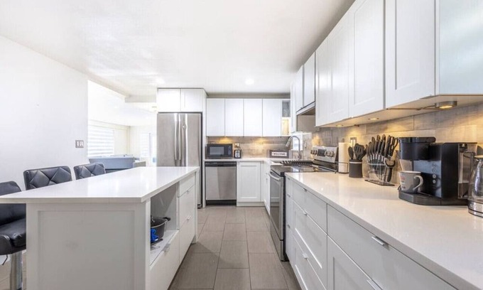 You’ll immediately notice how the sunlight gently streams through the large windows of this gorgeous and spacious house, illuminating the contemporary furnishings, bright floors, and tasteful decor. Sink into one of the plush sofas in the living area, offering a perfect retreat to unwind from thrilling sightseeing. The modern open-concept living space features a well-appointed chef’s kitchen and a charming dining area.