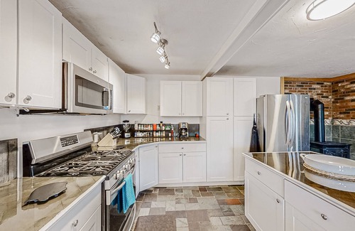 Feel right at home in the spacious Great Room, featuring a love seat, two armchairs, bench seating, and soaring vaulted ceilings. Watch favorite shows on the 47-inch TV in the bonus living area, featuring a vintage gas stove. Whip up tasty dishes in the kitchen, equipped with a full suite of appliances. When it’s time to eat, gather at the wooden dining table that extends to seat 10. Extra perks include complimentary WiFi, a washer/dryer, two air mattresses, beach chairs, and hiking sticks.