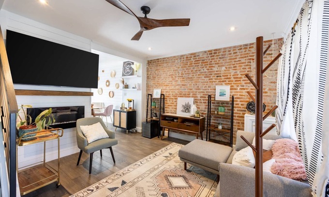 Step into a bright and welcoming living room featuring exposed brick walls, a 70-inch HD Smart TV with access to Netflix and Amazon Prime Video, and an electric fireplace that creates a cozy ambiance. Thoughtfully decorated with unique artwork and eclectic touches, this space is designed to make you feel right at home.