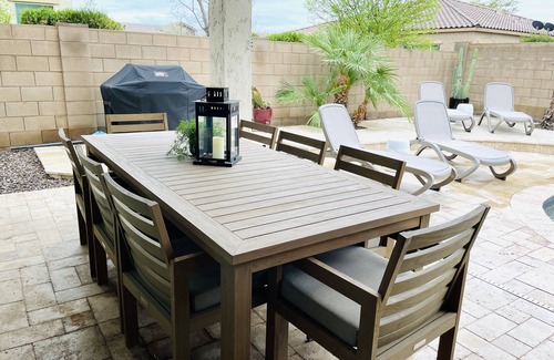 Bring your family to Queen Creek rest, relax and unwind in this modern desert oasis. With plenty of space to sleep 10-16 people. Your entire family will find relaxation and entertainment here. Enjoy the gorgeous backyard oasis with patio seating and outdoor dining around the bbq. Relax poolside while taking in the beautiful sunshine, enjoy our heated pool, with waterfall, green turf area and plenty of room to lounge in the sun. Afterwards, cool off indoors around a game of pool, or enjoy the cozy, spacious family room for a movie time together. This oasis makes for perfect for down time with your family.
