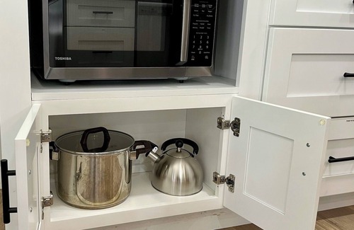 Kitchenette & Bathroom: Fully equipped kitchenette with a fridge, microwave, toaster, and stovetop. The studio also features a modern bathroom.