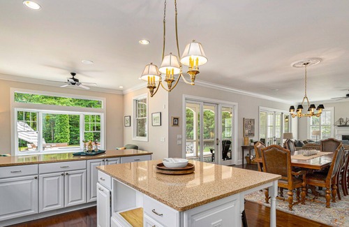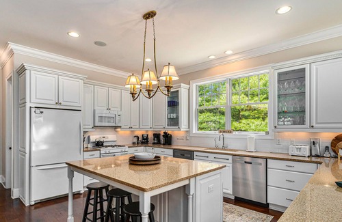 Southern Charm has two main-floor bedrooms (one with a king bed and one with a queen bed) and four upper-level bedrooms. The spacious living area is open to the dining area and kitchen so the entire family can hang out together during meals and family time. There is a great screened porch access from the dining area that leads to the pool so you can keep an eye on the little ones.