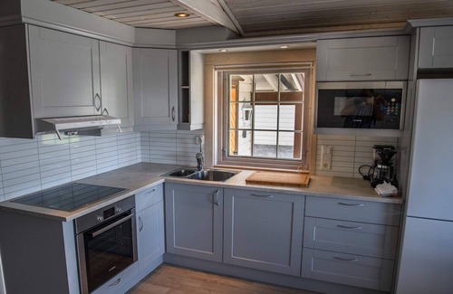Layout: Kitchen(stove(induction), coffee machine, microwave, dishwasher, fridge(+ freezer)), Living/bed room(TV(norvegian TV channels )), bedroom(double bed, bunk bed), bedroom(double bed, bunk bed), bedroom(2x bunk bed), bathroom(washbasin, shower, toilet), bathroom(washbasin, shower, toilet), sauna(shared with other guests, indoor, heated), heating(central), terrace, garden furniture, parking