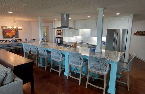 The large, newly renovated, 4/3.5 main home on the point features gorgeous undisturbed views of Castello island with breathtaking sunset views. The home sleeps 10 in beds. The HUGE island has seating for 8 with an additional 8 person dining table. The kitchen with double oven, fridge, gas stove, dishwasher, coffee pot and Keurig is open to the large living room with views to the large covered patio and lake views.