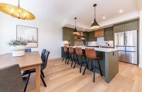The spacious living area has tall 16 foot ceilings and a modern and high-end kitchen with stainless steel appliances, induction stove and even a wine fridge! The dining room has a large dining table with enough space for everyone staying with you.