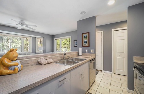 Inside the home, gather in the spacious living area for a group movie night, or snuggle close to the fireplace on chilly nights while reading. Head into the well-appointed, full kitchen to whip up delicious meals together. The second floor boasts a bookcase and cozy reading nook for quiet afternoons.