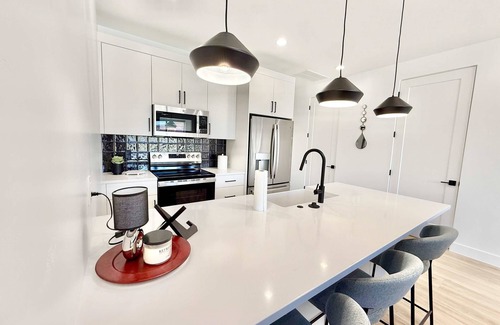 The primary suite upstairs features a comfortable queen sized bed, large closet, balcony access, and ensuite bathroom with a beautifully tiled walk-in shower and double vanity.