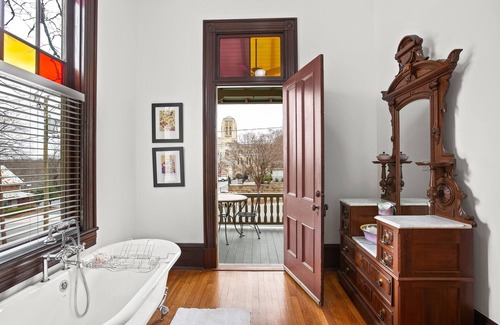 The Ludlow Grand Suite found in The Summit Street Inns is a large first-floor room filled with natural light from the beautiful, stained-glass windows that cover the walls and offer views of St. Paul’s Episcopal Church and 5th Street. It features a king-size bed and décor inspired by historical antiques. Private porch access is a unique addition to this room with a balcony porch with table and chairs overlooking the garden and St Paul's Episcopal Church. The spacious bathroom has a clawfoot soaking tub and oversized walk-in shower.
