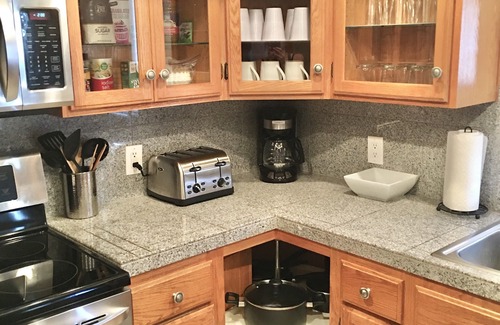 FULLY EQUIPPED KITCHEN: Toaster, coffee maker, pots, pans, glassware, coffee mugs, rice cooker, crockpot, blender, knives, dinnerware, silverware, cooking utensils & much more.