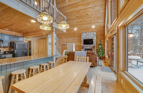 This hillside log home boasts fantastic views of Schroon Lake and peak views of Pharaoh Mountain, and it also offers shared beach and dock access! Three levels of open living space will accommodate your whole group, and outside you'll have a campfire area and room to park six cars. Inside, the main floor has a great room with plenty of comfortable seating, a full kitchen with granite countertops, a casual dining area, and two bedrooms. The upper level has a private main suite with a sitting area, and there's an open loft space that overlooks the main level. Downstairs, you'll find a family room with a bunk bed and a TV, plus the last bedrooms.