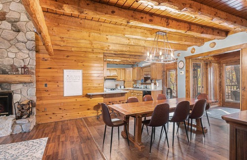 Lovely, spacious log cabin on forested half-acre located on the beautiful Lake Monterey public golf course near the Sandy Pines Resort area. Features include an indoor, 8-person hot tub, ping-pong table, foosball table, tv, dvds and games, indoor wood-burning fireplace, outdoor dining area, and huge front porch for relaxing and hanging out. Pets welcome. Baby gates installed on stairs for families. However, little ones will need to be monitored in the loft area and hot tub room.