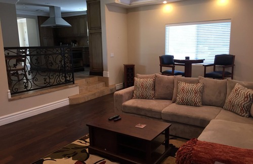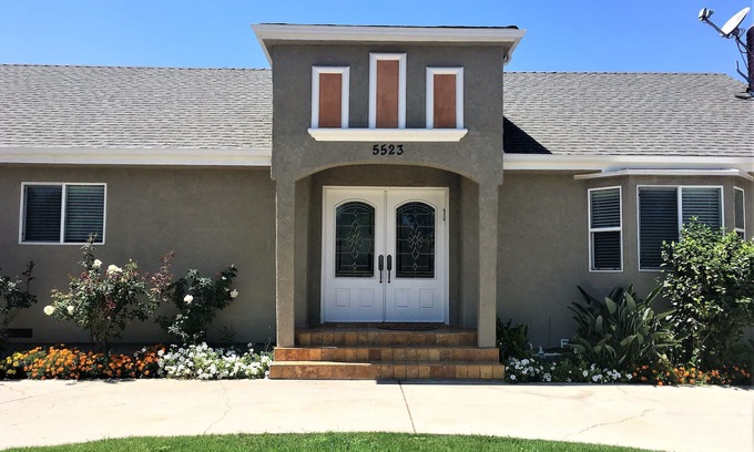 Spacious 2600+ square foot 4 bedroom, 4 bath home that sleeps 10 - 14 people. If interested in shorter than 30 night stay, please contact me, so that I may direct you to one of our other beautiful properties. This is a luxury home centrally located near tourist attractions. The house is nicely decorated and has hardwood floors throughout. It has 4 large bedrooms that sleep 8. It has 4 stone tiled bathrooms, in addition to a den and a bonus room that can sleep up to 6 people. The kitchen is spacious and fully equipped with top of the line major and counter top appliances, along with beautiful granite counter tops. It has all you need to cook up a special family meal. The house is fully furnished with all the comforts a large family home can offer......the living room has a nice comfy sectional and 2 large recliners, the cozy den has comfy sofas with a large 50" TV and a bar height table with chairs for added seating and card playing and the beds have quality mattresses for a good nights sleep. There is a nice courtyard with an outdoor dining table and there is a barbecue grill and additional sitting in the yard. Plenty of room to enjoy an outdoor grill with the family. There is also a ping pong table and other outdoor games. The house is located close to freeways and a 5 minutes drive to stores and restaurants on the Boulevard. The Studios and Hollywood are just a few miles away. The perfect vacation getaway family home. For stays less than 30 days, please contact me as I have other lovely homes in the area.