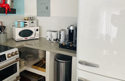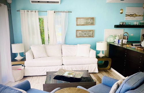 The ground floor apartment has one large bedroom (one king bed) with a sitting area, and an en suite bathroom. On a hot day you may enjoy the comfort of the air conditioned indoor living area and fully equipped kitchen. Attached is a beautiful spacious patio where you can lounge and take in some sunshine or relax in the shade with a cocktail.