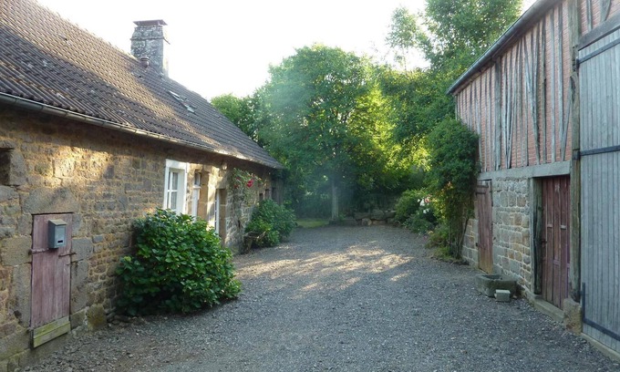 Sleeps 5/6, 3 Bedrooms. Comfortable rustic cottage with high ceilings, oak beams and an enormous old fireplace with a very effective wood-burning stove and a beautiful barn facing the front door. The view from the back door is across the fields to the historic moated Chateau de Carrouges. The cottage has been in the family as a second home for over 40 years, with many pictures on the wall by the owner's mother and friends. Ideal for children with semi-enclosed south-facing rustic lawn to the rear, a tiny field for safe camping beside the courtyard and a beautiful old barn with table tennis between the cottage and quiet country road. The house is situated in a small hamlet, five minutes drive (10 minutes by bike) to market town of Carrouges, where there is a bakery and a good butcher/delicatessen, a small but well-stocked supermarket and several other useful shops. The cottage has central heating (electric) as well as the stove and is well equipped. Also WIFI/internet access.