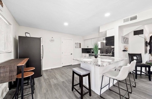 Recently upgraded and furnished throughout, this spacious and private four-bedroom home features an open floor plan with a modern kitchen, counter-height seating, dining area, and a living room with 65” Smart TV.