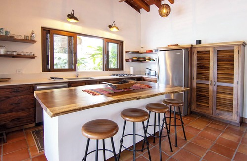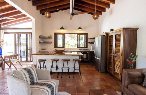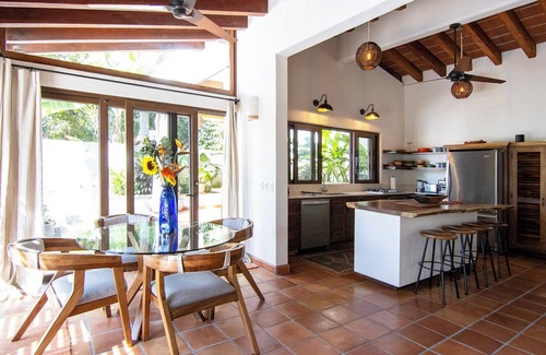 Relax with the whole family at this peaceful place to stay just a block from the lively heart of San Pancho. Villa Onda has everything you need for a private retreat: a large heated, salt-water pool, air conditioning, fiber optic internet, fully stocked kitchen, 2 bedrooms on the upstairs level with a spacious primary suite on the main floor, an outdoor shower, cascading fountain in the outdoor dining room and spacious living room and kitchen. We are excited to invite you to stay at Villa Onda!