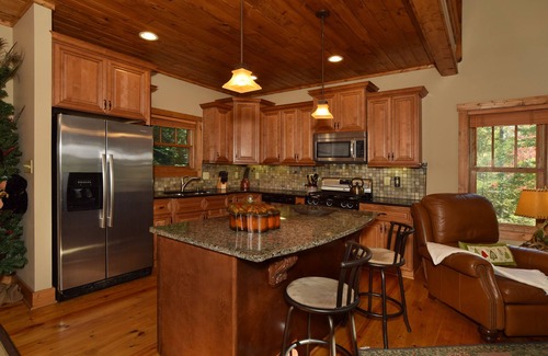 MAIN GREAT ROOM/KITCHEN/DINING – The main level is completely open with a great room, kitchen, dining area, half bath and door opening to a partially covered deck to enjoy the beauty of the surrounding nature. The great room boasts a vaulted ceiling and is perfect for relaxing with upscale leather sofa and chair, gas stone fireplace and 65" smart TV. The kitchen has been designed with custom cabinets, brand-new, top-notch appliances, granite countertops, timber ceiling and everything you would need to create memorable meals and dining experiences – from glassware and cookware to kitchen gadgets, nothing has been left out. The upscale dining table easily accommodates 8 and the kitchen island an additional 2. On the upper deck you will find rustic patio furniture in the covered section, as well as a Weber gas grill and outdoor dining table with 6 chairs.