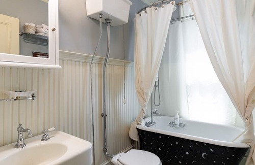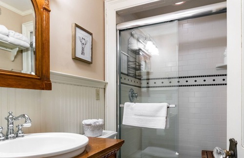 Use one of 2 staircases to ascend to four second-floor bedrooms, 2 with en-suite bathrooms. The Balcony Suite primary has a sitting room, a large walk-in closet and sleeping area with a king-size iron bed, a fireplace and a balcony overlooking the grounds. The en-suite bathroom is done in green marble and features double basins in a reproduction wood dresser, a decked-out steam shower as well as a luxurious soaking tub. The Canopy Suite is furnished with bed steps to climb into an antique iron canopy bed, dressed with lace. A window nook is lit for relaxing with or without a book. The en-suite bathroom has a large shower. The third bedroom is the Palm Room done with Colonial style furnishings including a queen size sleigh bed with a plush mattress. The 4th bedroom is the Cowboy Room featuring a western theme featuring a full size bed and an amazing view. This bedroom also has a large desk and a wireless printer perfect for remote work or school. The hall bathroom is steps away and features a restored original claw foot tub with intricate shower fixtures and a pull-chain toilet.