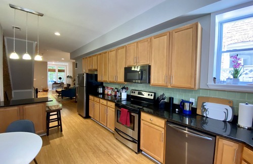 You will have exclusive use of the entire main house. The first level includes a large living room with soaring ceilings, an office space with desk and neighborhood views, portable Bluetooth Bose speaker, a half bath, and eat-in kitchen with tons of counter space and everything you need to prepare and enjoy a wonderful meal at home. The table in the kitchen opens up to seat four guests (there are two additional chairs in the home to complete the seating).